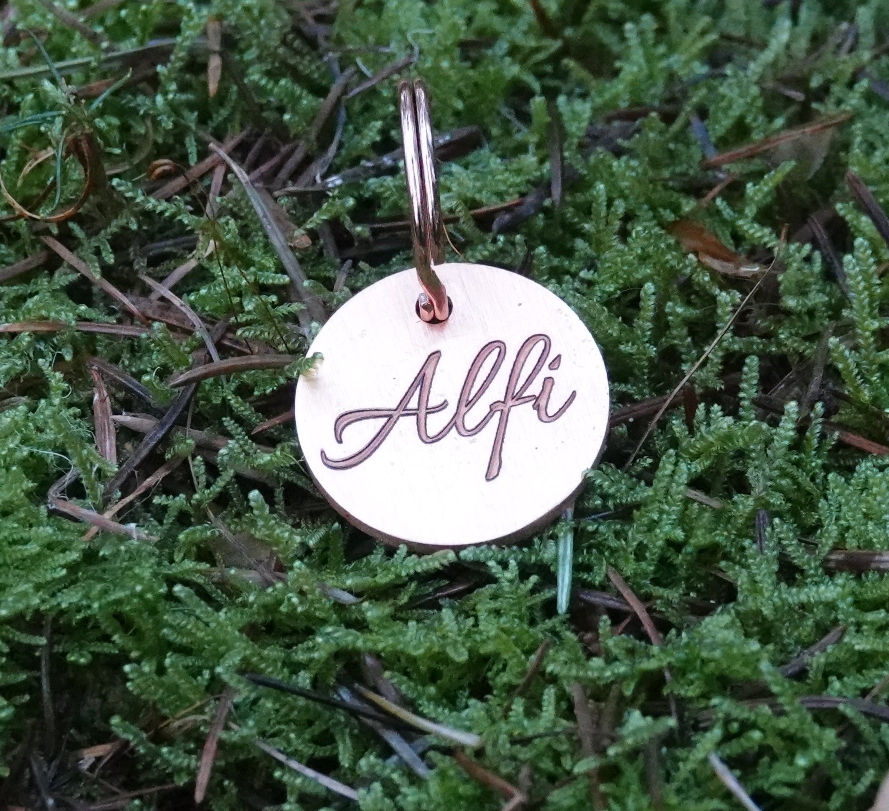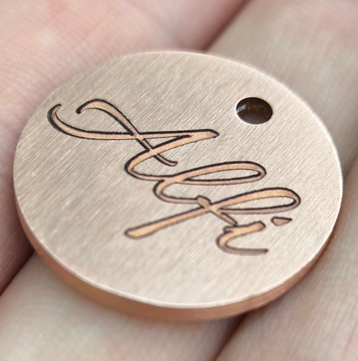 Unsere Hundemarke Kupfer mit Gravur ist 25mm groß.