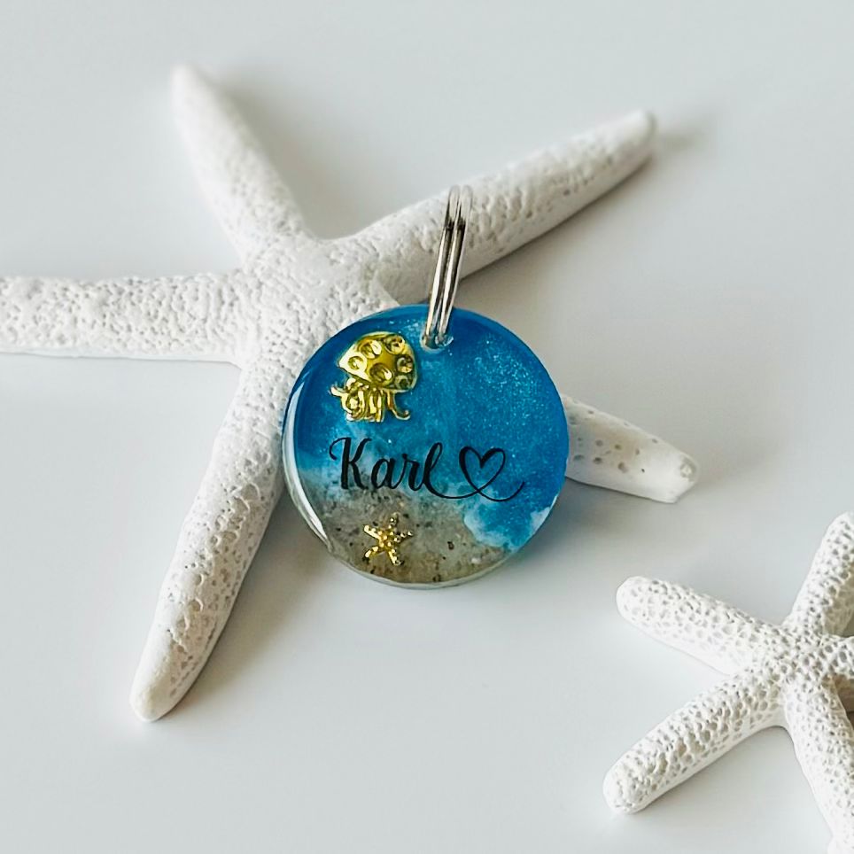Unsere Hundemarke Strand mit schwarzer Schrift ist 25mm groß.Die Marke ist mit verschiedenen Inlays im Meereslook bestückt, ob diese in Silber oder Gold sein sollen kannst du auswählen. Die Motive variieren.